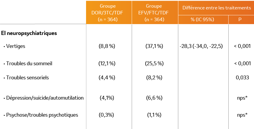 DOR/3TC/TDF = 100 mg de doravirine, 300 mg de lamivudine et 300 mg de fumarate de ténofovir disoproxil ; EFV/FTC/TDF = 600 mg d’éfavirenz, 200 mg