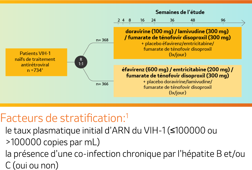 *Sur les 734 patients randomisés, 6 patients n’ont pas reçu de traitementet ont été exclus (4 patients dans le groupe DOR/3TC/TDF et 2 patients dans le groupe EFV/FTC/TDF).