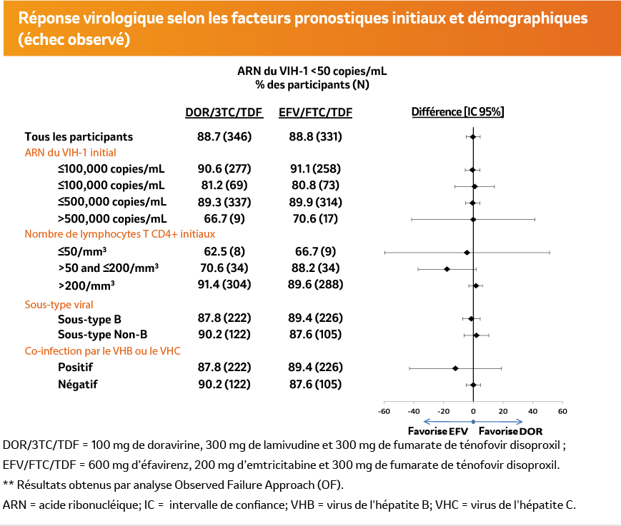 Efficacité démontrée en fonction des facteurs à l’inclusion (taux d’ARN du VIH-1, nombre de CD4, statut hépatite B et C) 2