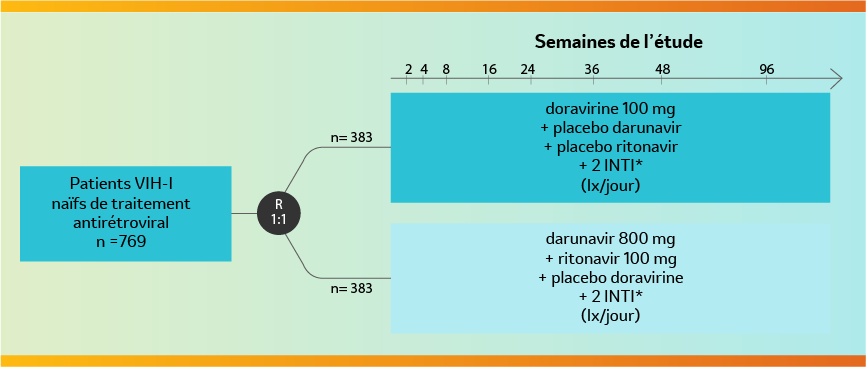 INTI= inhibiteur nucléosidique de la transcriptase inverse; ARN= acide ribonucléique. #La population FAS était composée de tous les sujets randomisés ayant reçu au moins une dose du médicament àl’étude et disposant de données initiales pour les analyses nécessitant des données initiales. *Au choix de l’investigateur: ténofovir 300mg+emtricitabine 200 mg OU abacavir 600 mg + lamivudine 300 mg.