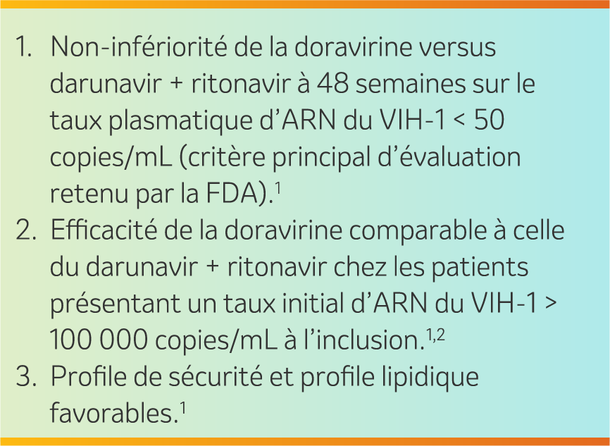 - Molina JM, Squires K, Sax PE, et al. Doravirine versus ritonavir-boosted darunavir in antiretroviral-naive adults with HIV-1 (DRIVE-FORWARD): 48-week results of a randomised, double-blind, phase 3, non-inferiority trial. Lancet HIV. 2018;5(5):e211-e220.