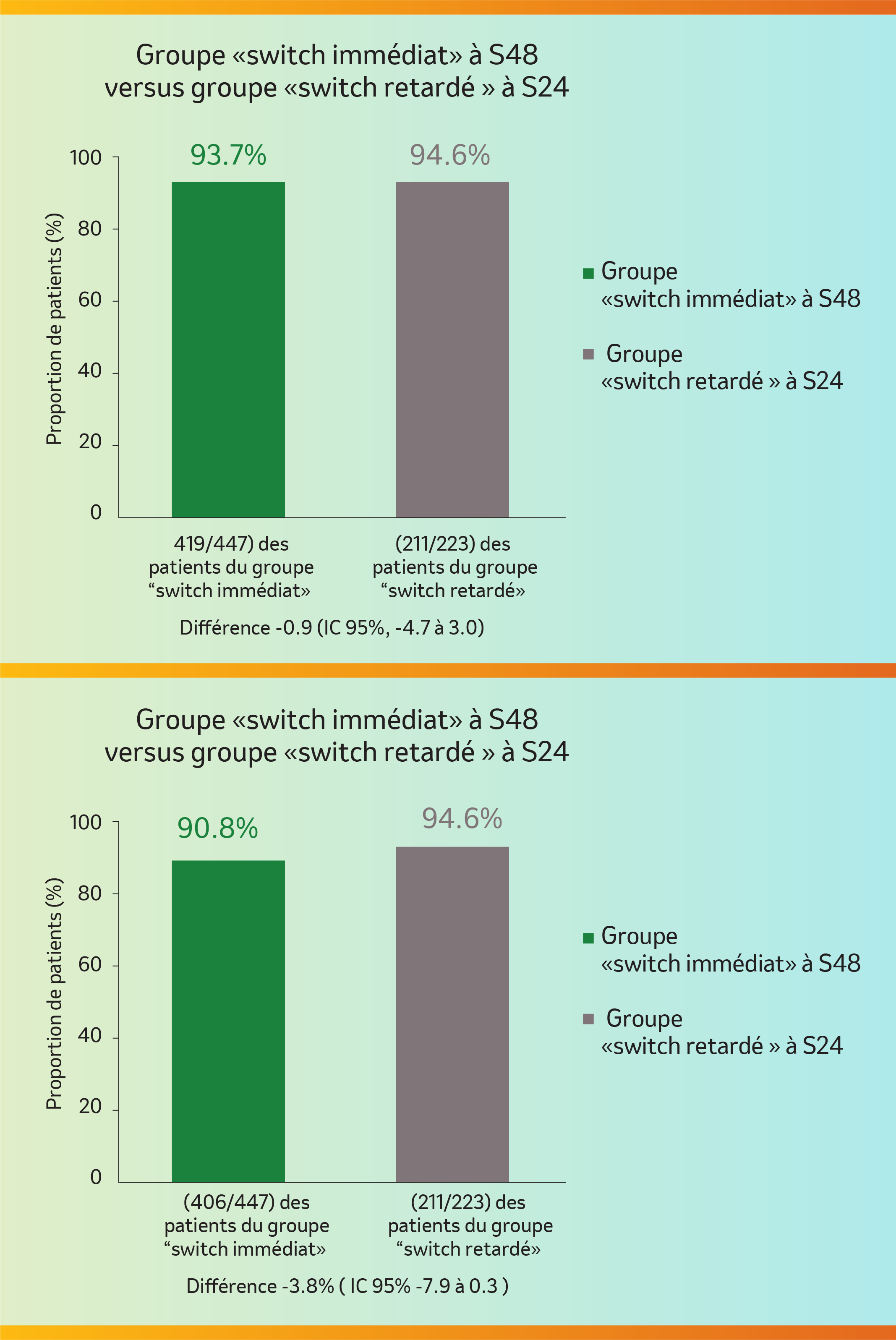 Non-infériorité° du switch immédiat vers l’association DOR/3TC/TDF à S48 et S24 versus switch retardé après poursuite du traitement initial* à la semaine 24