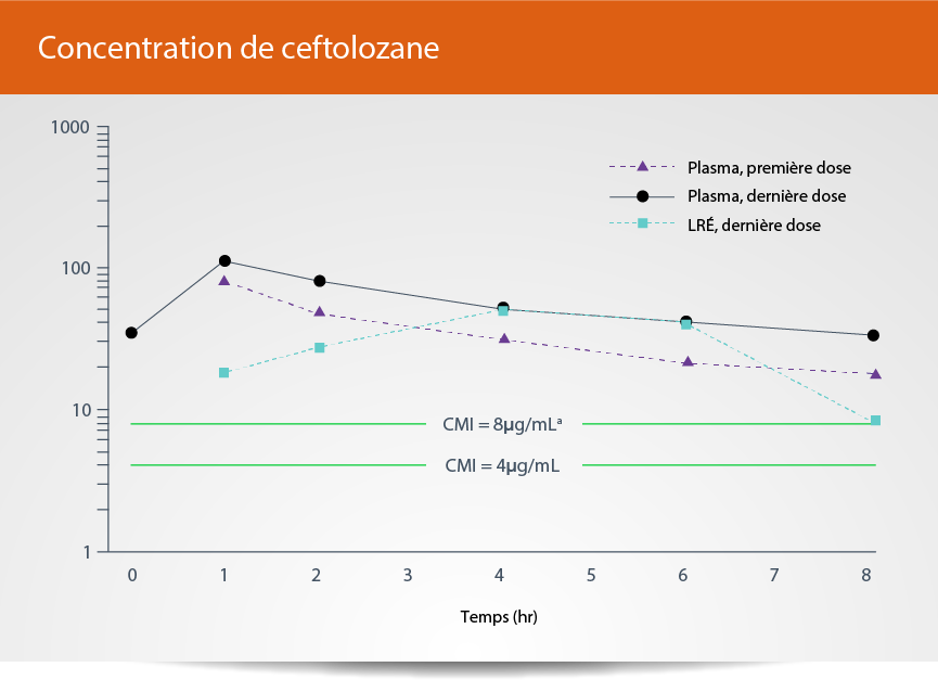 aLa CMI du ceftolozane non lié pour P. aeruginosa intermédiairement sensible est de 8 μg/mL.