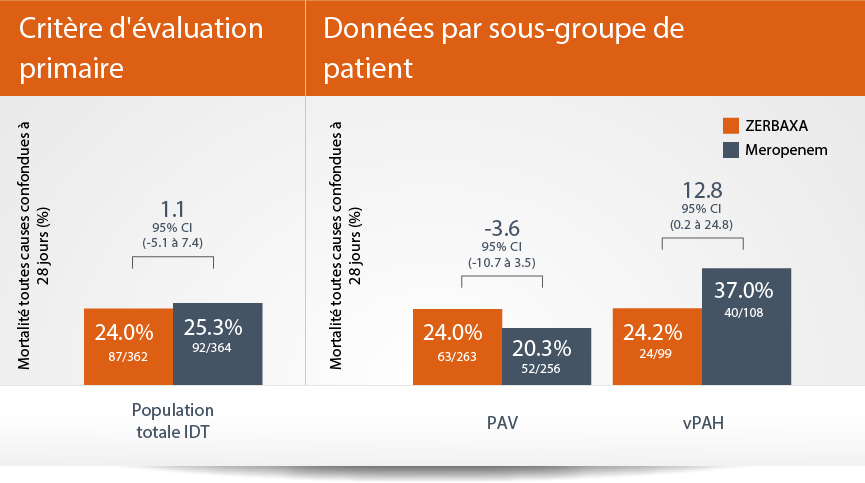 Dans le sous-groupe de patients vPAH (~28,5 %), La réponse était en faveur de ZERBAXA®: 24,2 % (24/99) VS 37.0% (40/108) pour le méropénem P = 0·025.