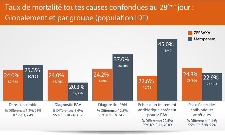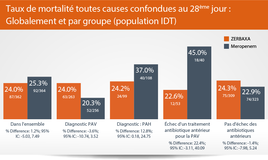 Chez les patients ayant reçu une antibiothérapie antérieure pour une PAV ou une vPAH, les taux de mortalité de toutes causes confondues jusqu’au 28ème jour étaient en faveur de ZERBAXA®.
