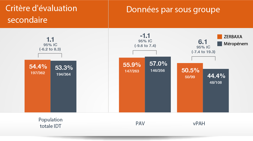 ASPECT-NP, Safety and Efficacy Study of Ceftolozane/Tazobactam to Treat Ventilated Nosocomial Pneumonia; IC, Intervalle de confiance; IDT, intention de traiter; vPAH, Pneumonie Acquise à l’Hôpital sous ventilation; PAV, Pneumonie Acquise sous Ventilation; TOC, test-of-cure