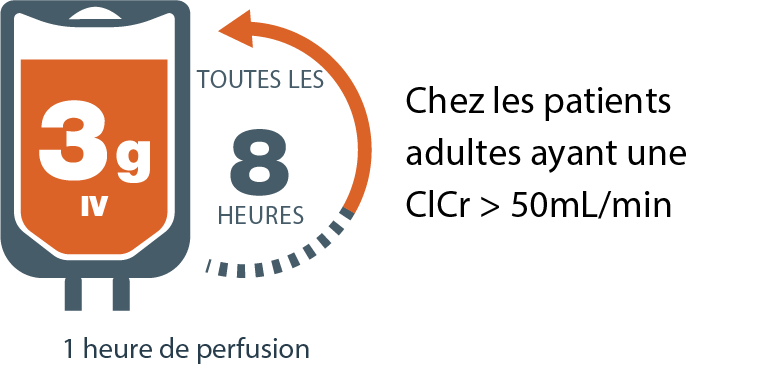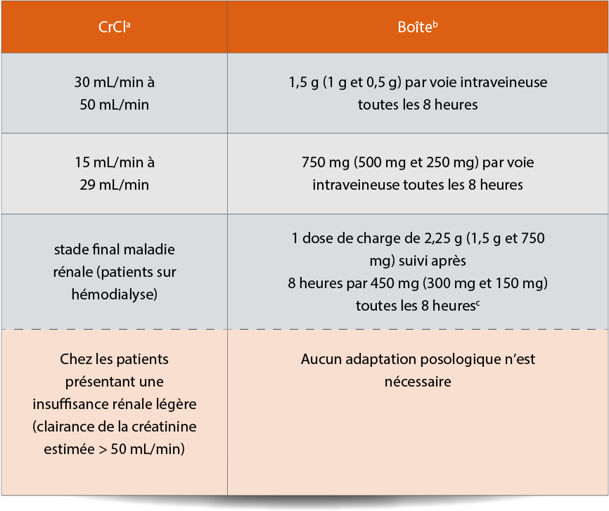Posologies recommandées pour ZERBAXA® 3 g chez les patients PAH/PAV atteints d’insuffisance rénale legere
